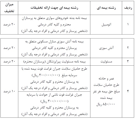 این تخفیفات شامل بیمه های مسئولیت حرفه ای پرستاران، بیمه بدنه اتومبیل، بیمه های آتش سوزی، بیمه عمر و حادثه می باشد.